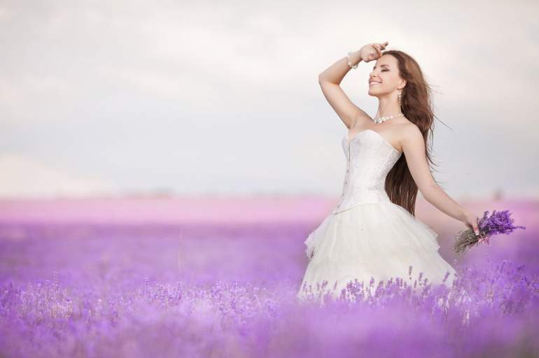Прекрасная жена в свадебном платье в лавандовом поле