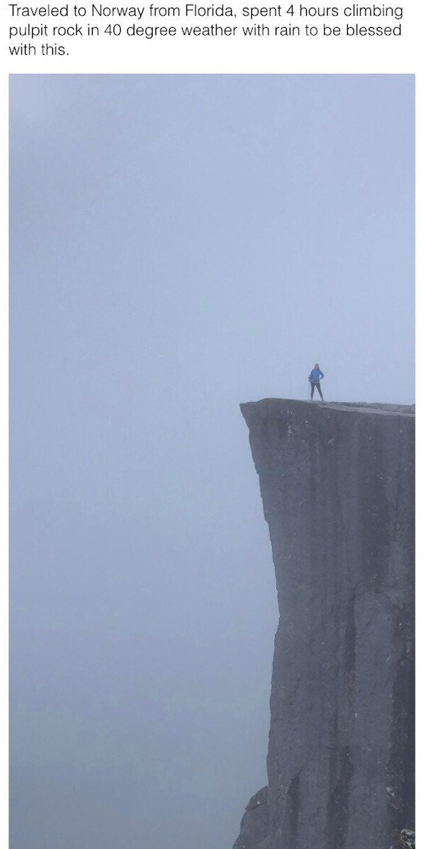 "Был в Норвегии, 4 часа карабкался на скалу, чтобы увидеть мир внизу - но увидел только туман"