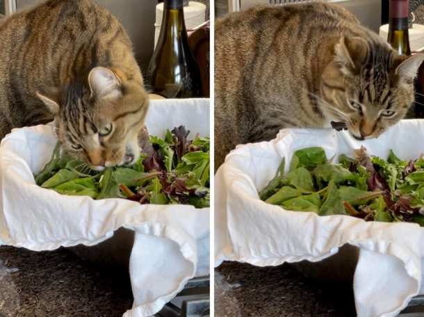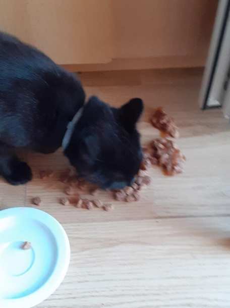 Заместо того, чтобы есть из миски, он вываливает корм на пол и слизывает только соус