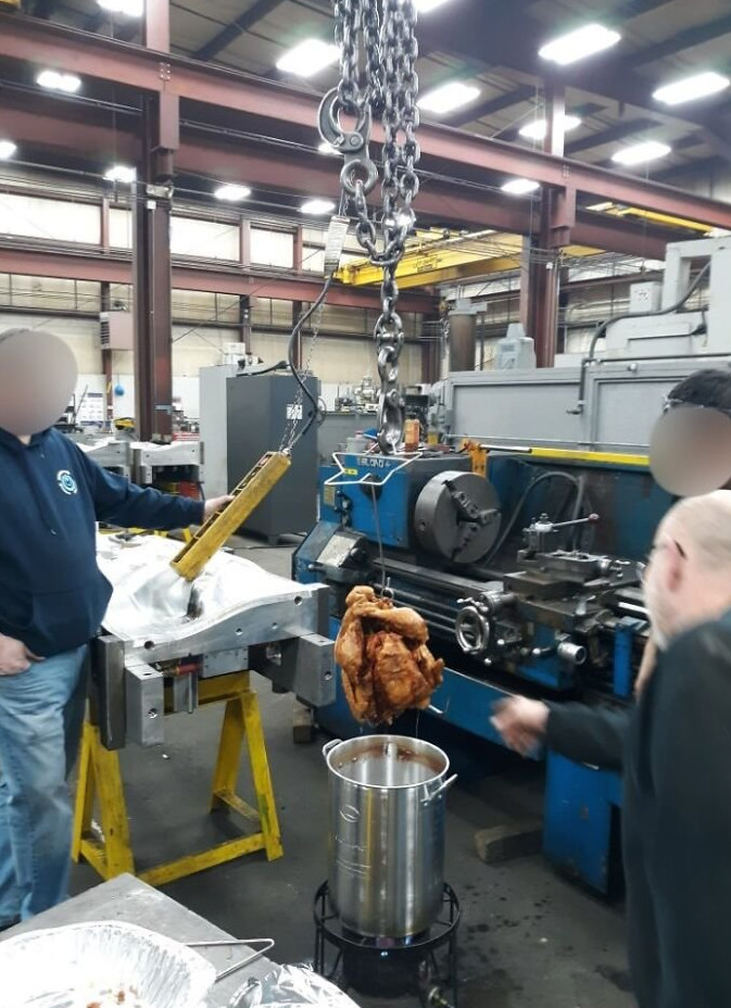Готовят индейку в магазине с помощью 30-тонного мостового крана.