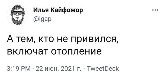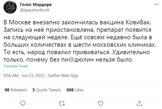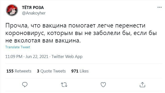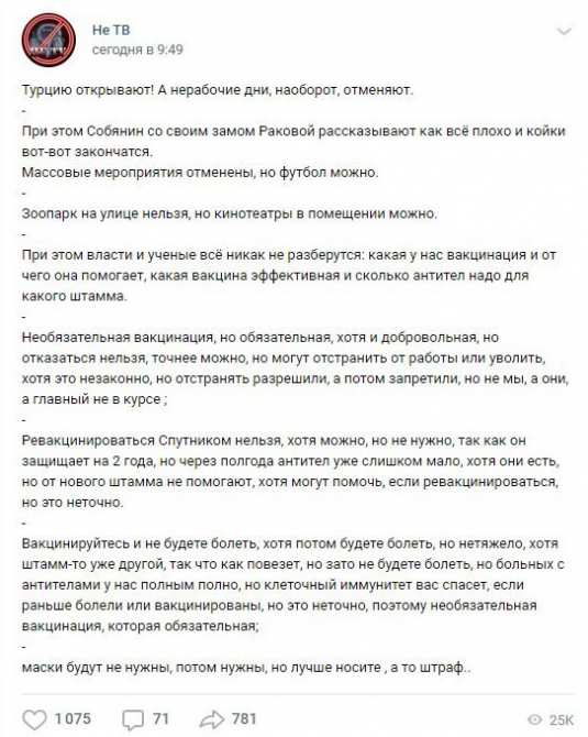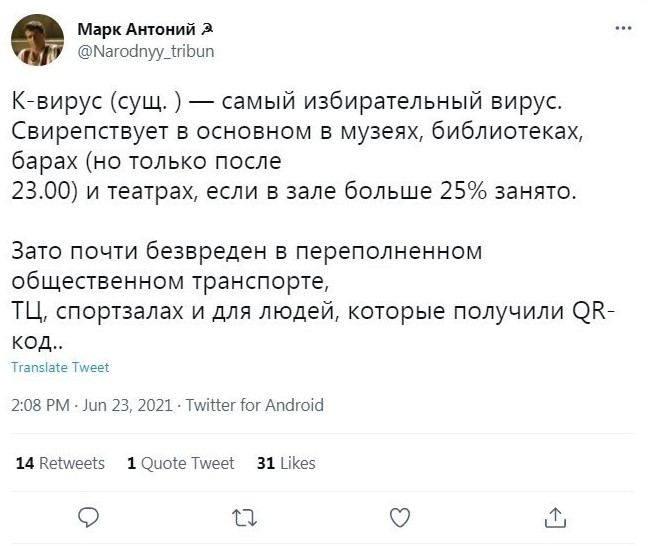 Что ж, эпидемия в Рф опять набирает обороты, и власти прикладываю различные административные усилия, чтобы склонить население к прививкам. Несознательные элементы упорствуют и потихоньку лишаются удобств и способностей. Что говорят на эту тему в соцсетях?