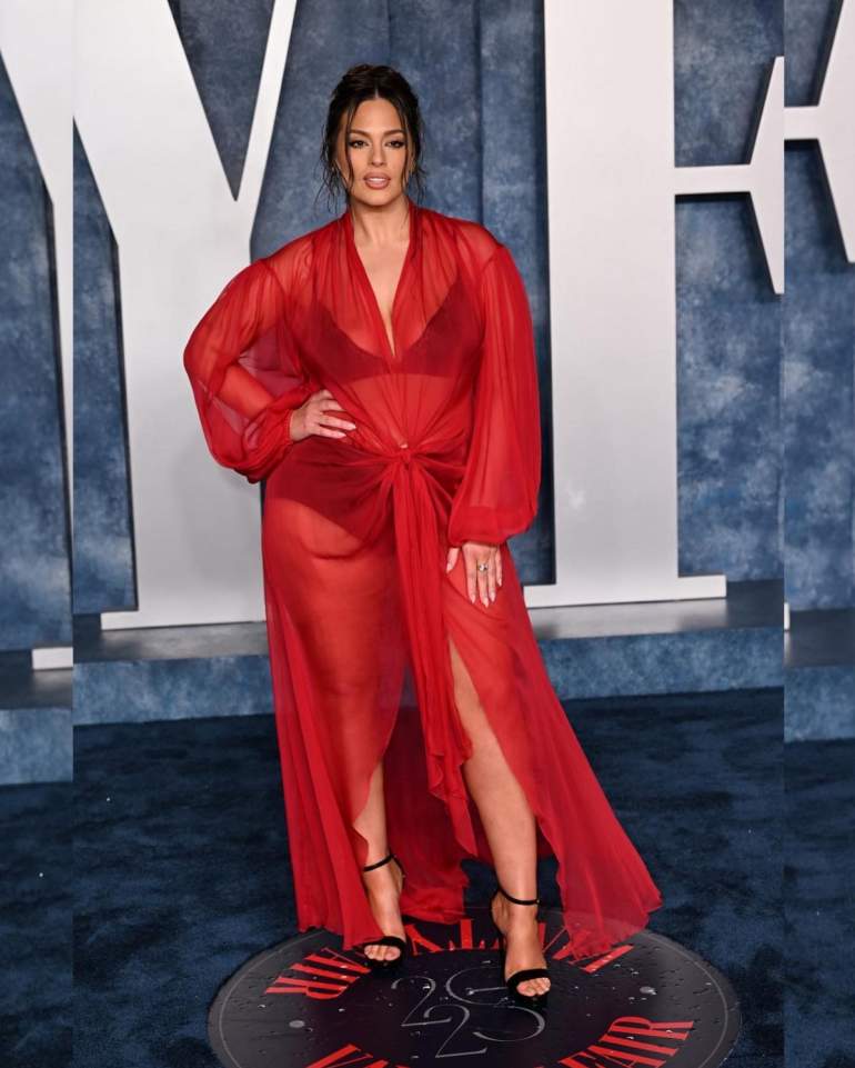На опубликованных кадрах модель предстала в фиолетовом бикини от Knix, состоящем из топа без чашечек и трусиков с завышенным поясом. Знаменитость демонстрировала свою фигуру под разными углами, показывая на камеру свои особенности, включая складки и растяжки на животе и бедрах. В то же время девушка распустила волосы и дополнила образ золотыми серьгами.