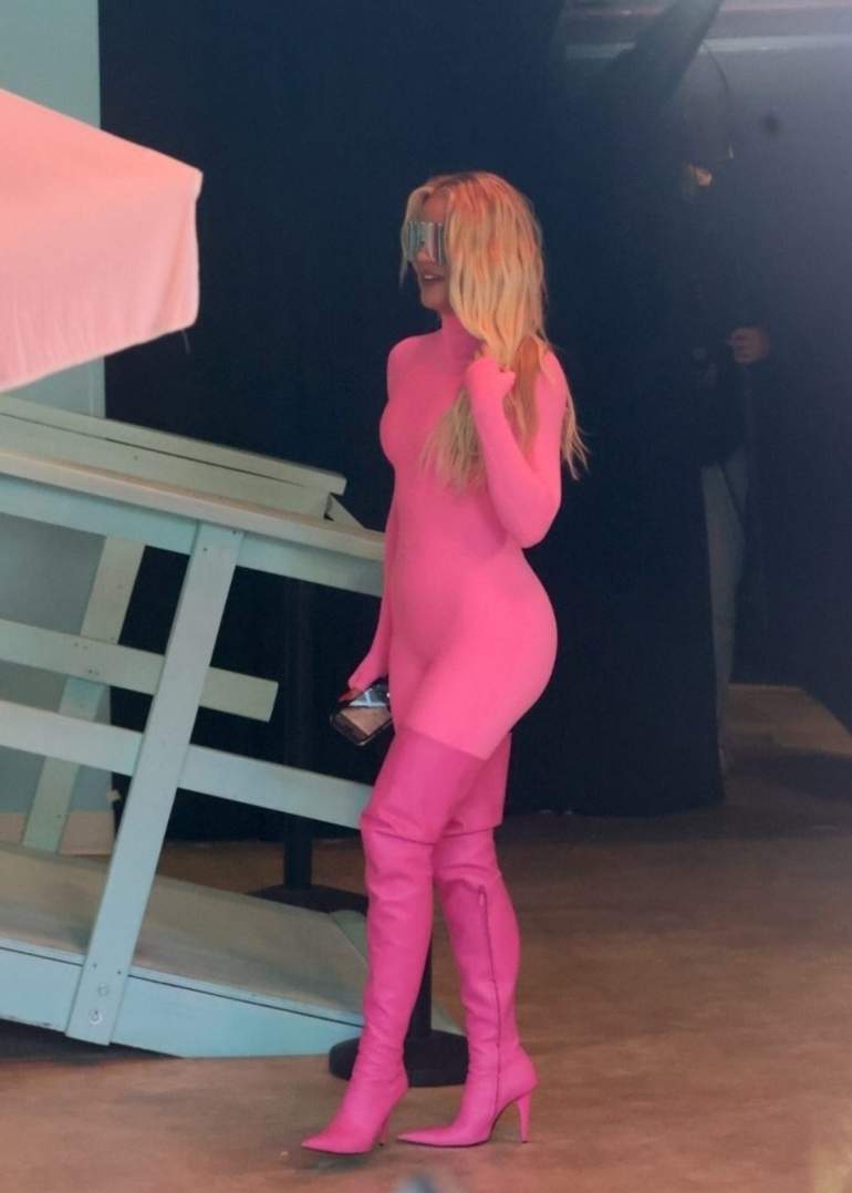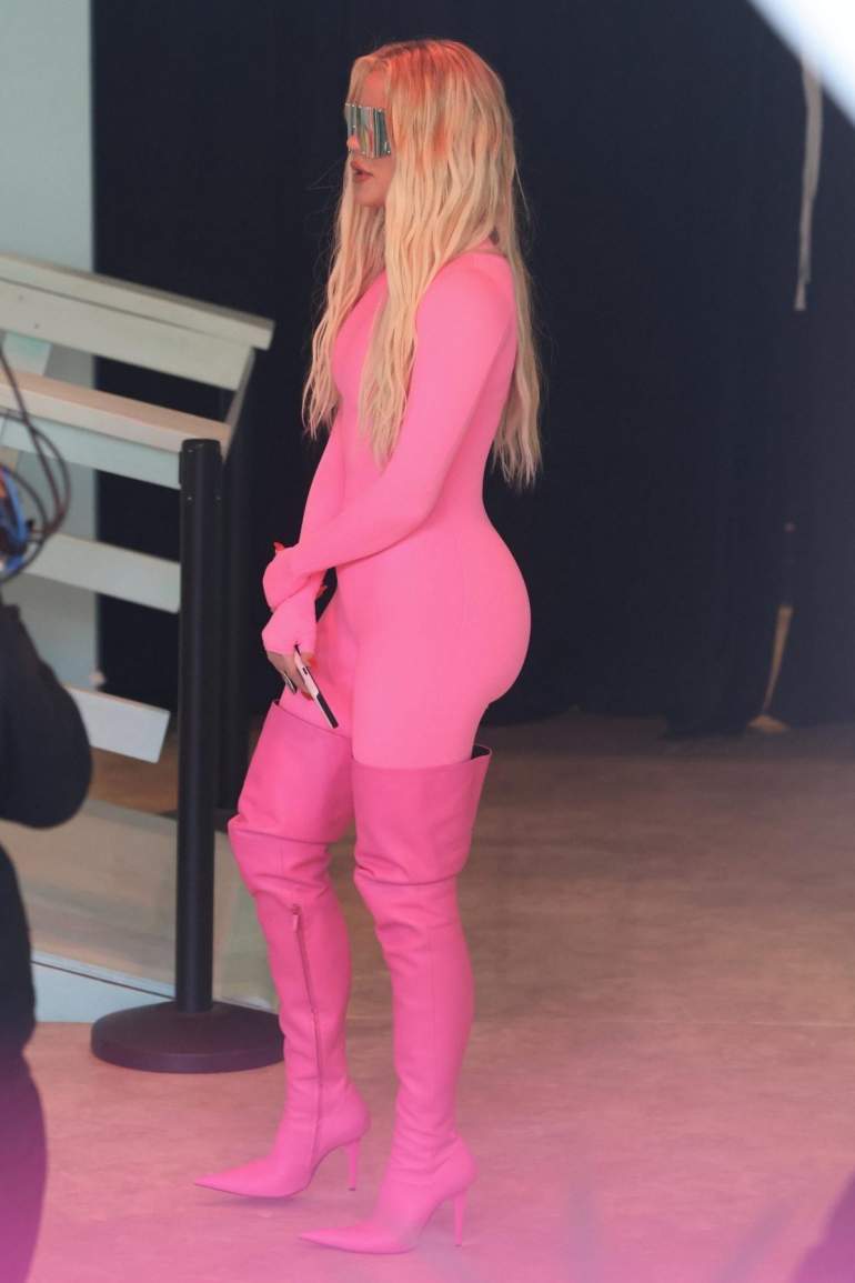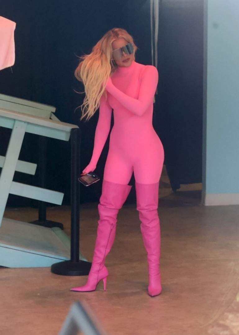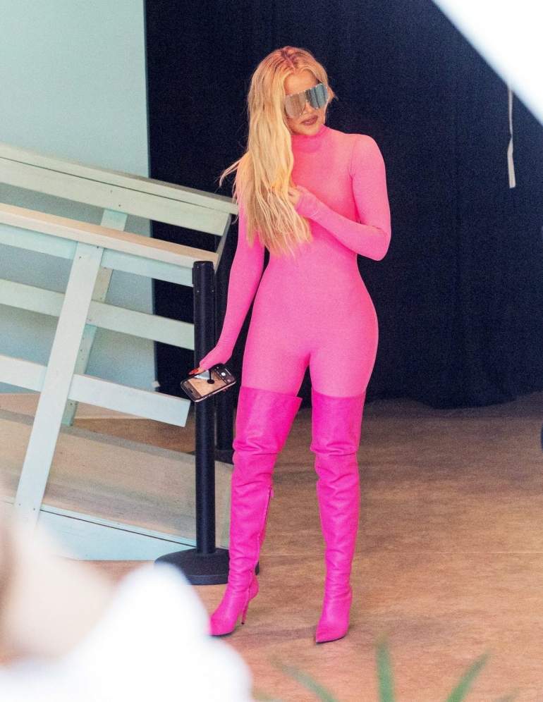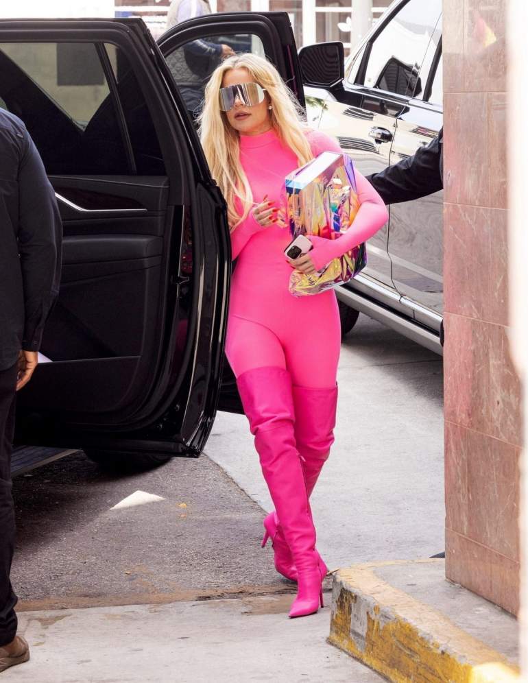 Фото: Хлои Кардашян в облегающем комбинезоне Американская телеведущая, бизнесвумен и предпринимательница Хлои Кардашьян, 38 лет, в обтягивающем розовом комбинезоне на выставке Barbie World x Paul Mitchell.