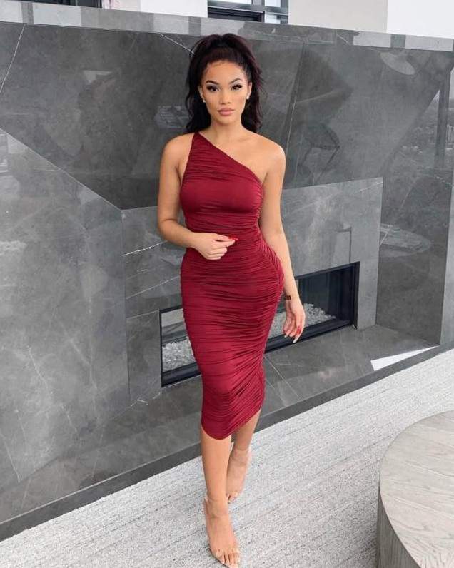 Красноватое платье на одно плечо