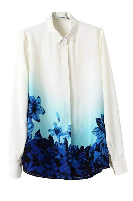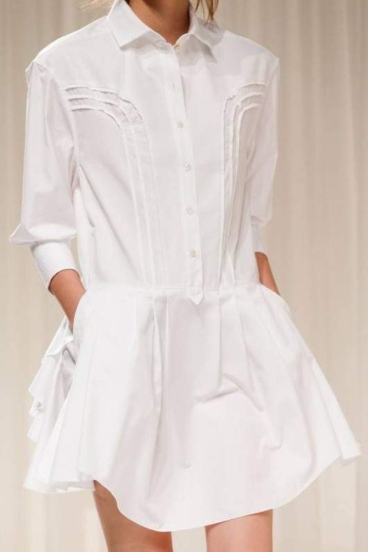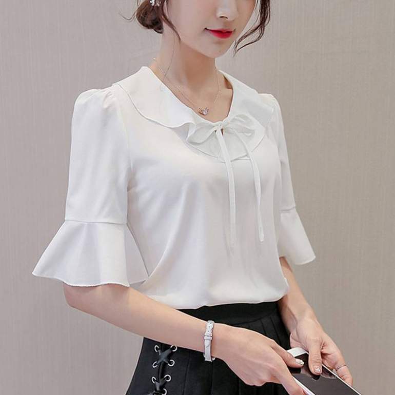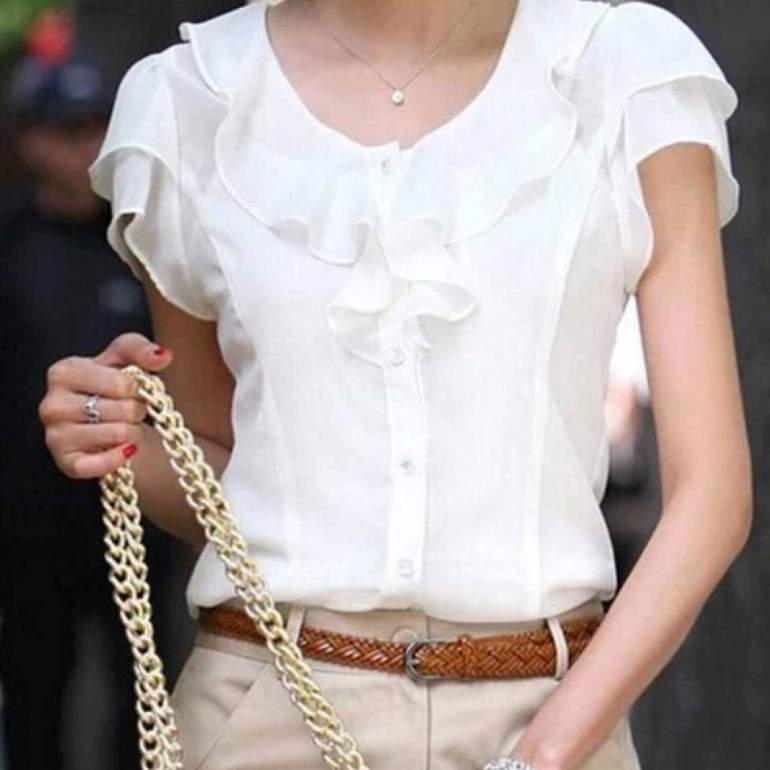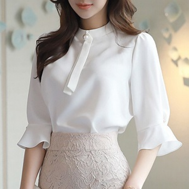 A White long-sleeved Blouse which has Frills on the end of the Sleeves