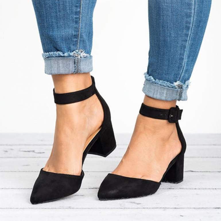 Босоножки с острым носом на низком каблуке.