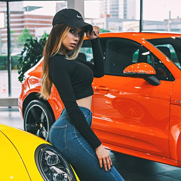 Милая женщина около машинки.