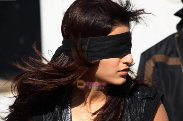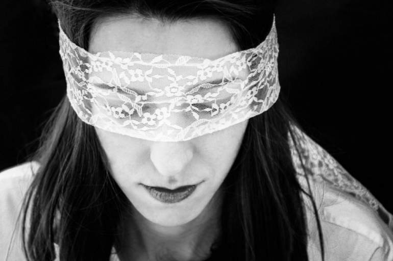 Девушка красавица с повязкой на глазах.