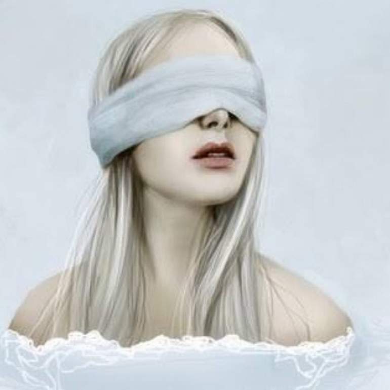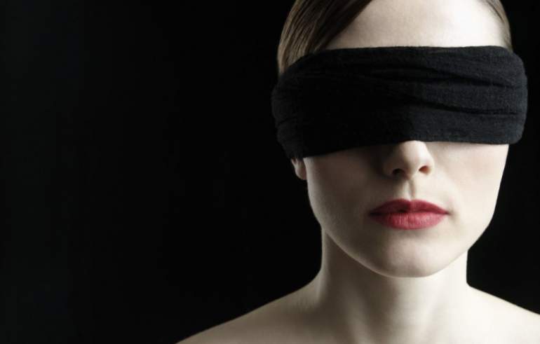 Блондинка с повязкой на глазах.
