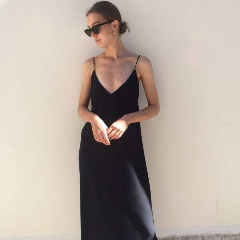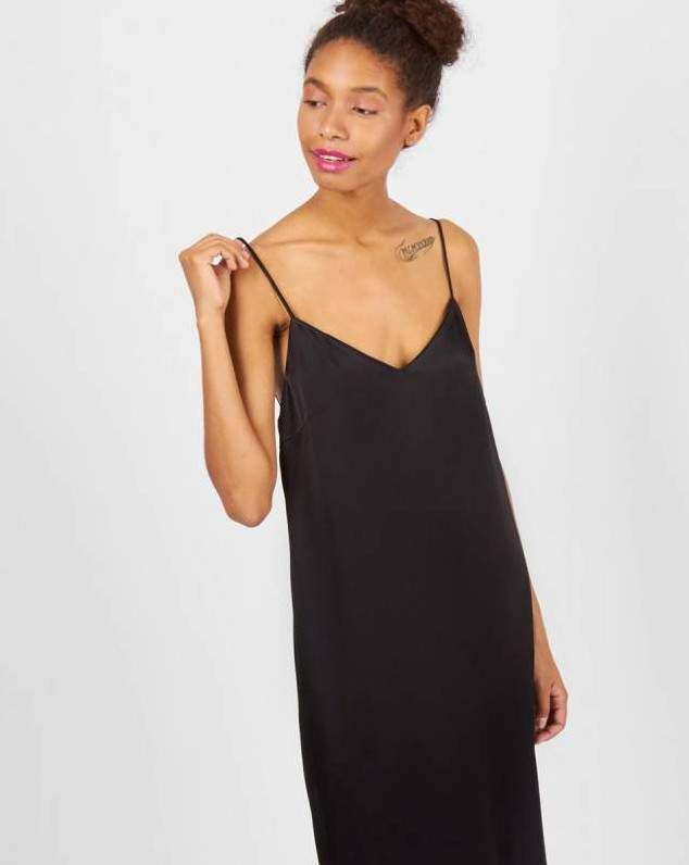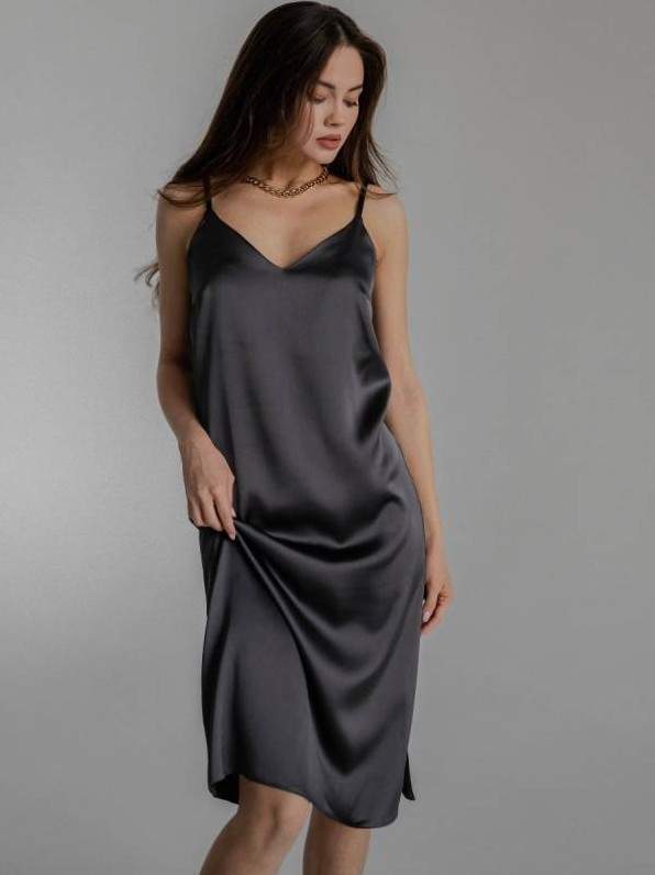 Темное шелковое платье на бретельках.
