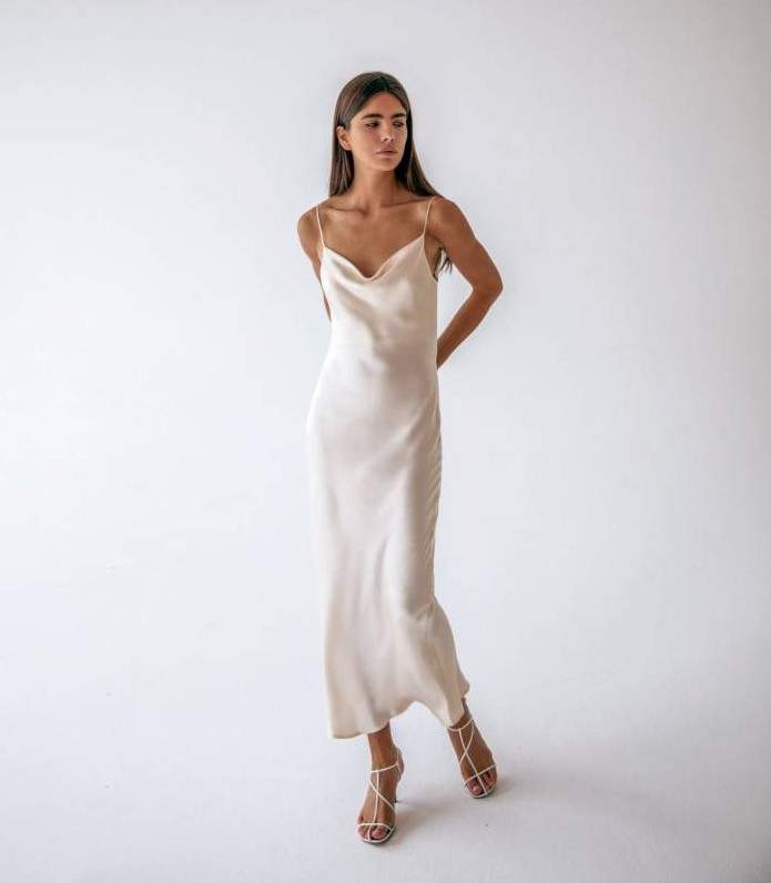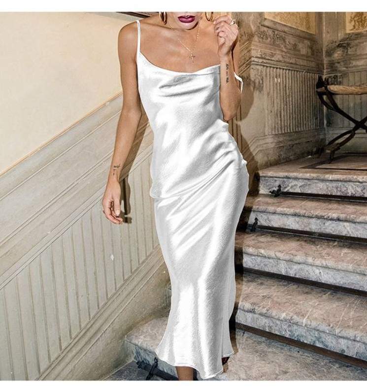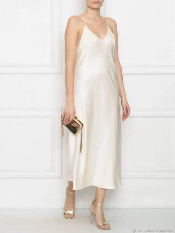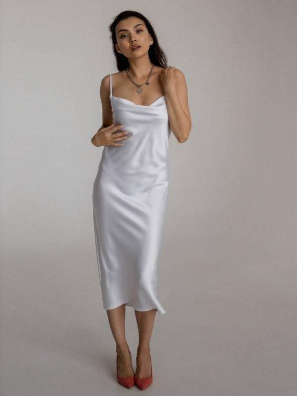 Белоснежное шелковое платье на бретельках.