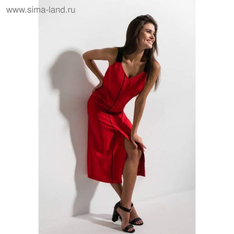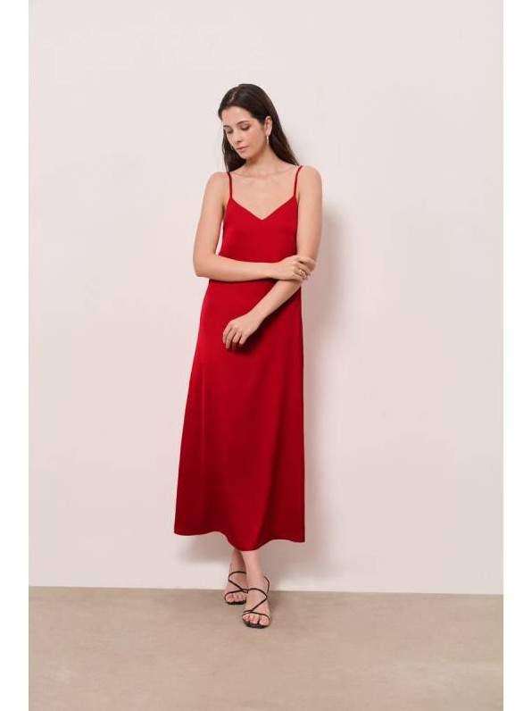 Красноватое шелковое платье на бретельках.