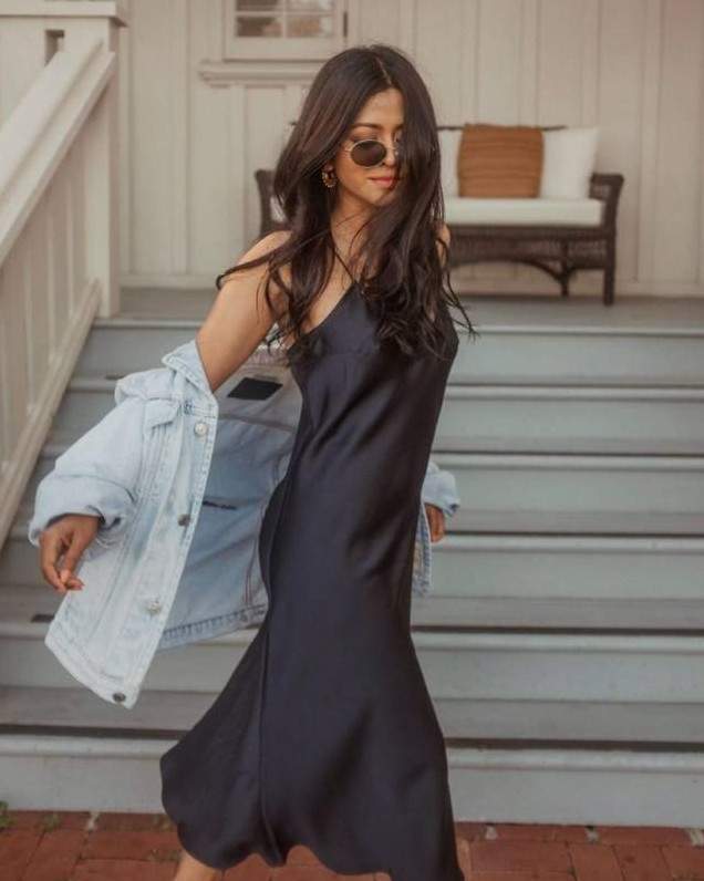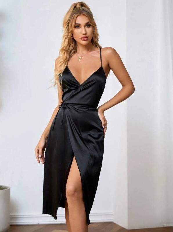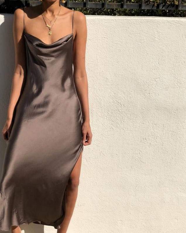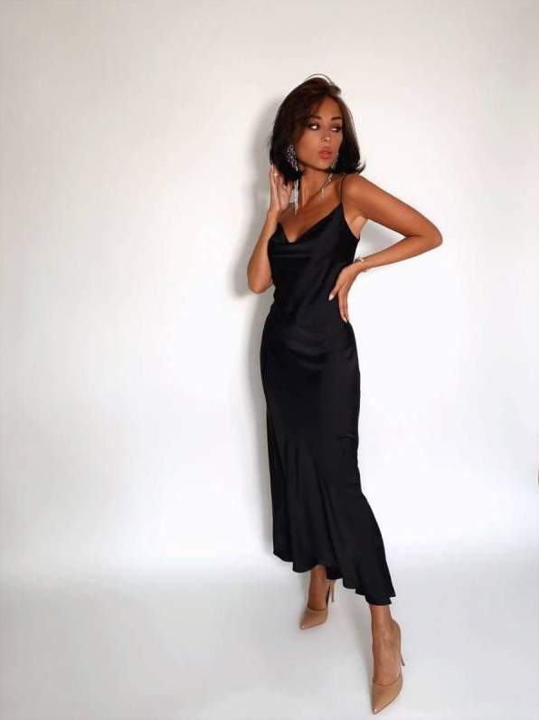 Темное атласное платье на бретельках.