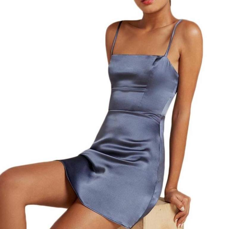 Темное атласное платье на бретельках короткое.