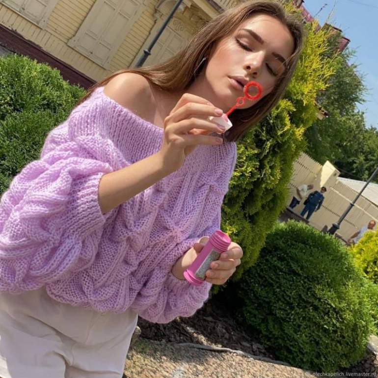 Сиреневый вязаный свитер.