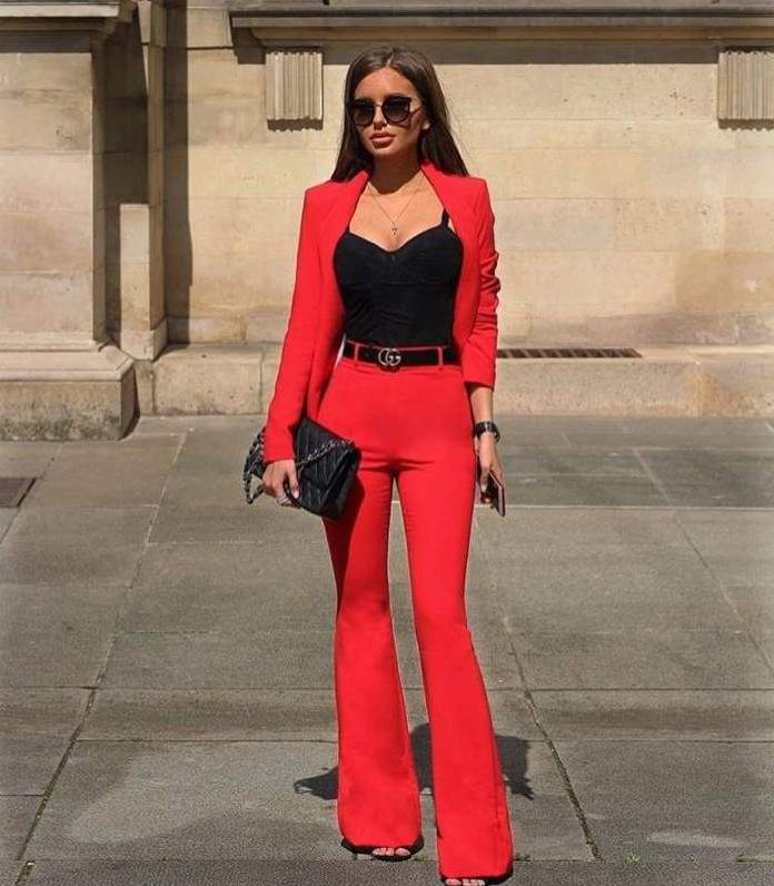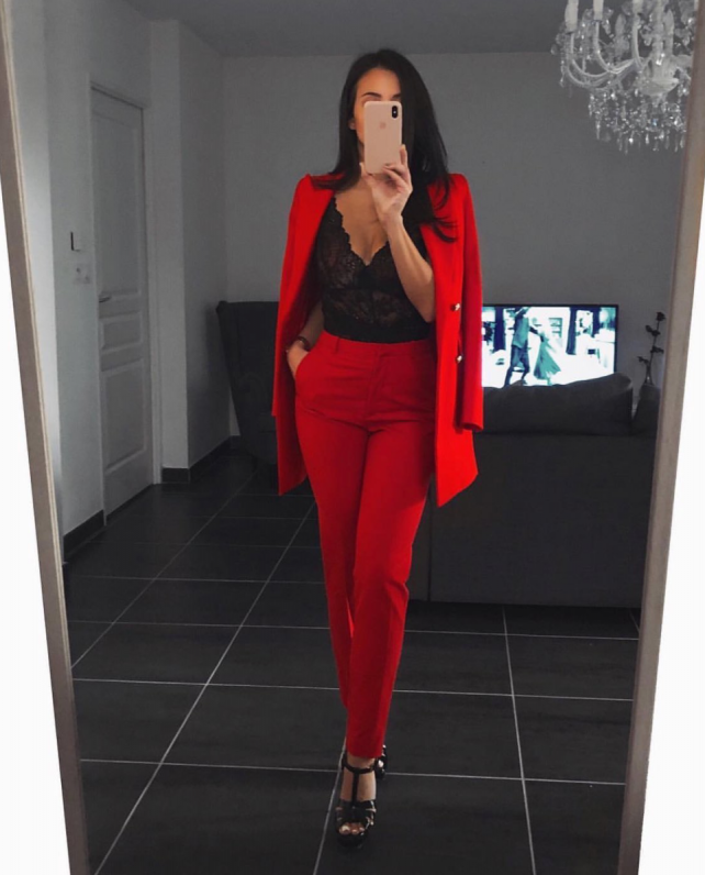 Очень красные штаны с черным топом.