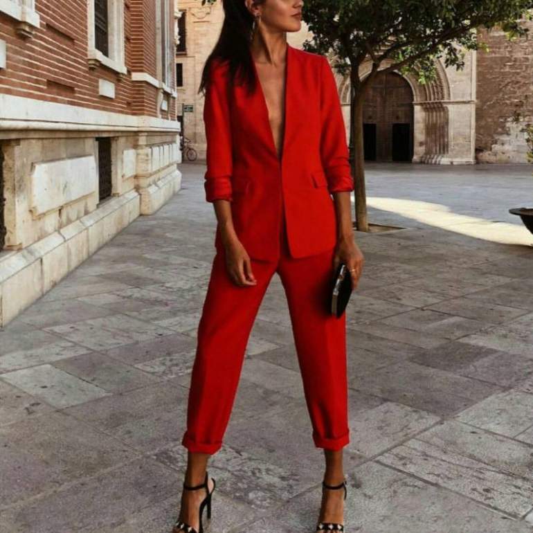 Очень красный костюмчик дамский брючный с топом.