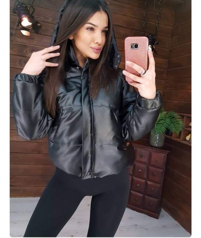 Кожаный пуховик дамский маленький с капюшоном.