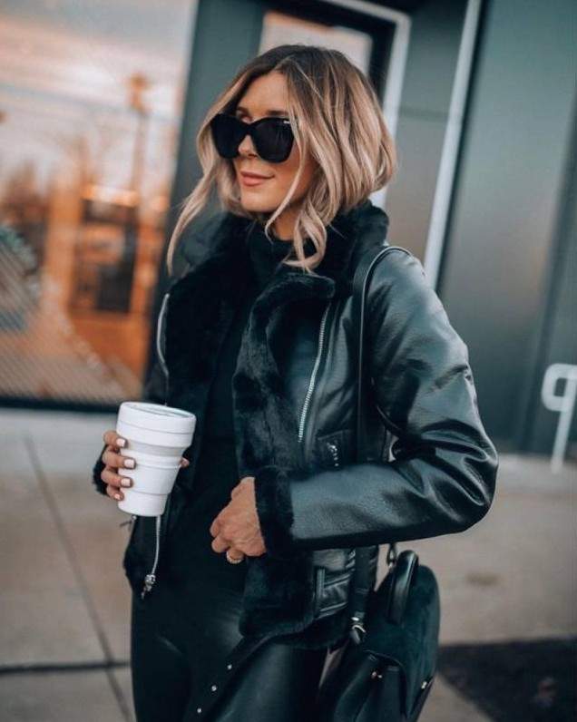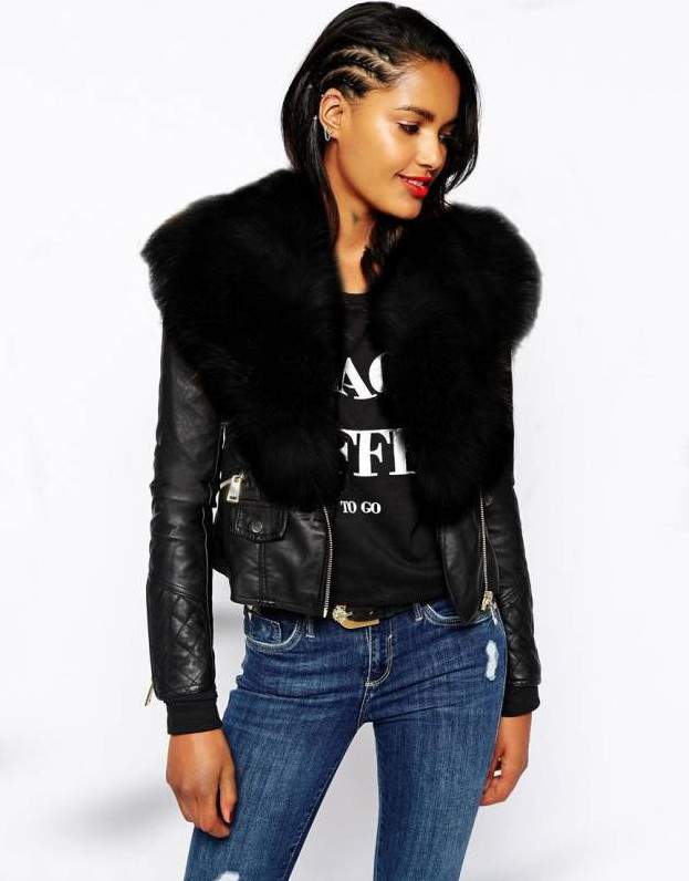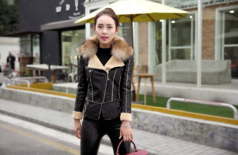 Девушка в кожаной куртке норковом воротнике.