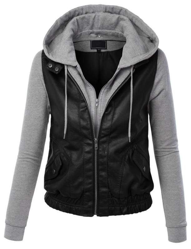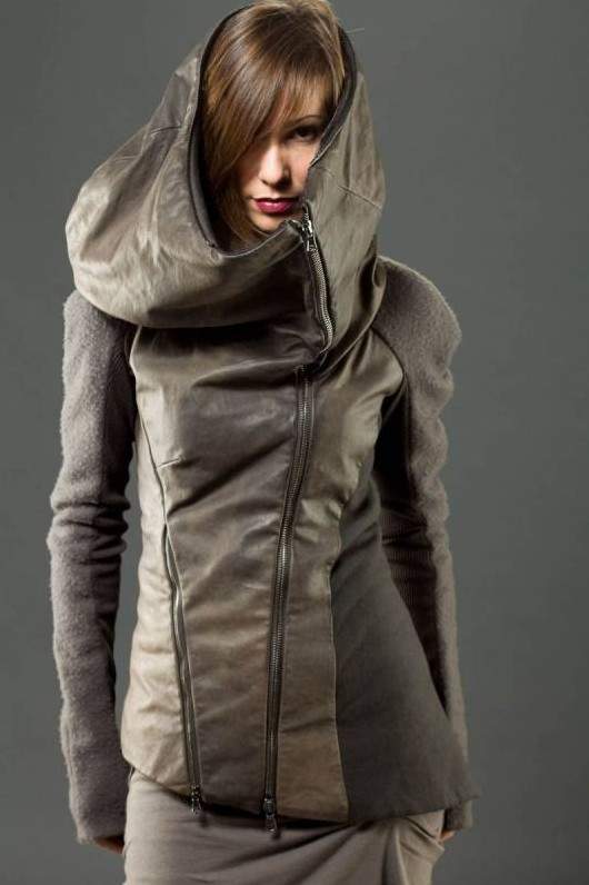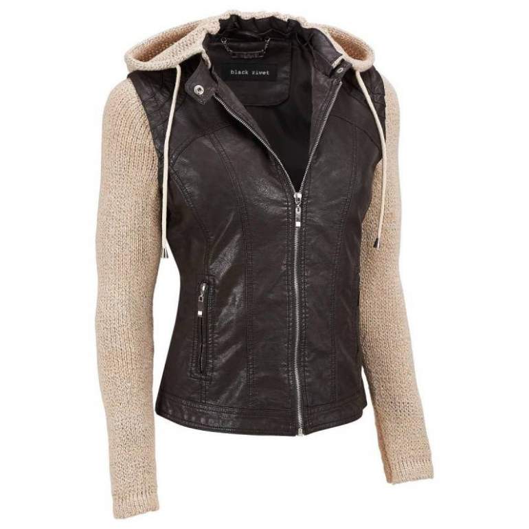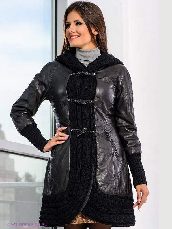 Кожаная куртка с вязаным капюшоном женская.