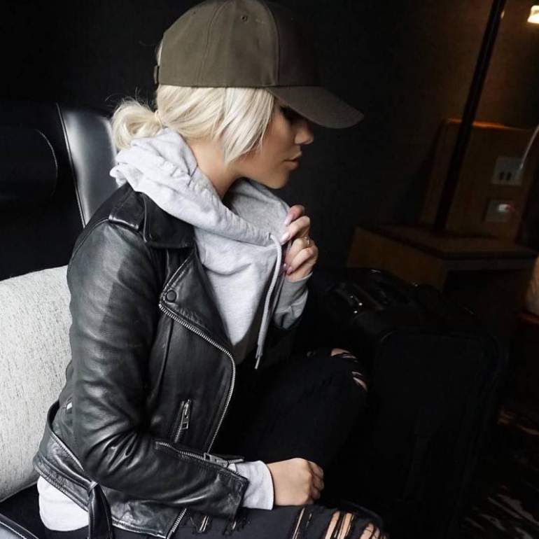 Street photo girl White Leather Jacket.