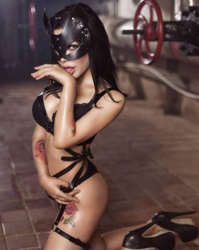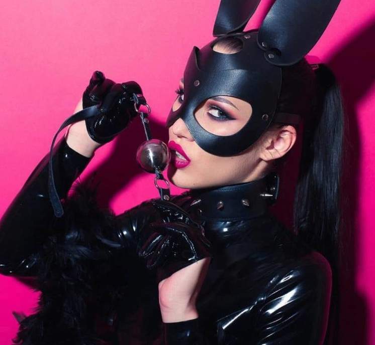 Красивая девушка в портупее и маске.