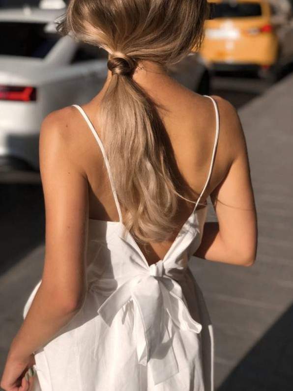 Красивая девушка в прекрасное платье со спины блондиночка.