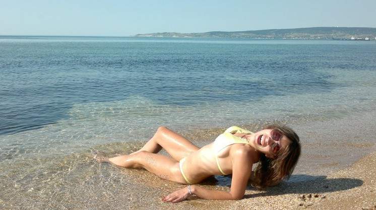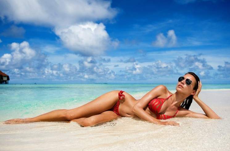 Милая и сексуальная прекрасная женщина 40 лет в купальнике.