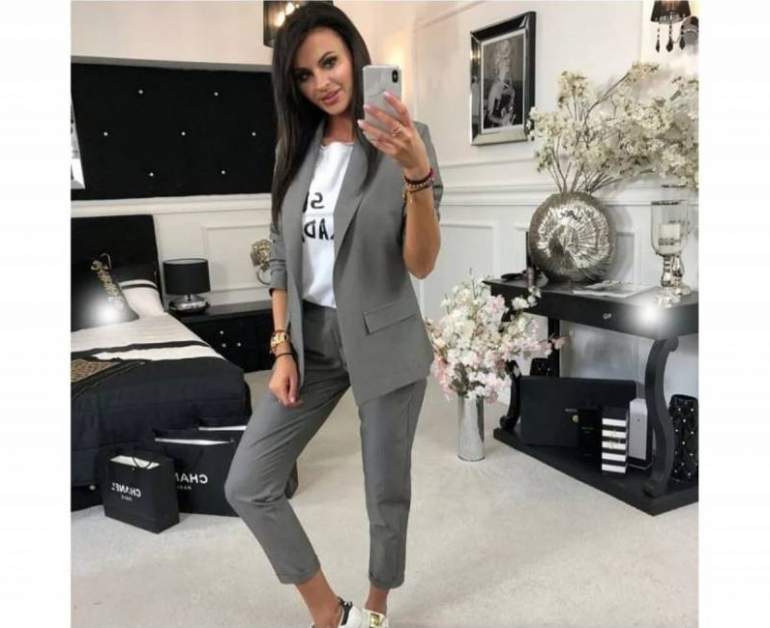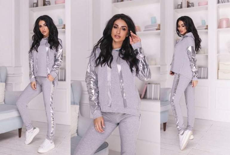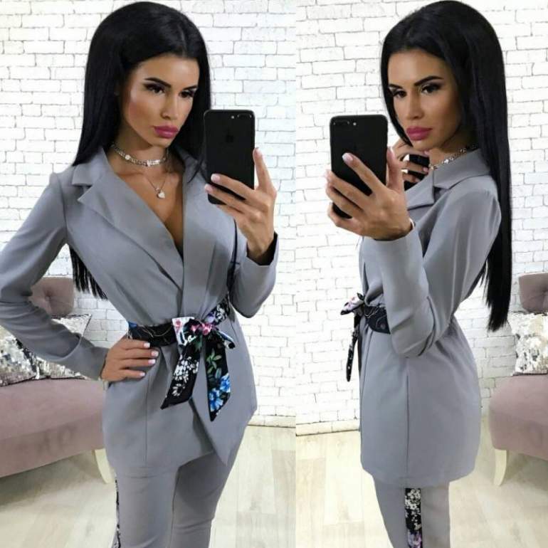 Зарина брючный костюмчик сероватый.