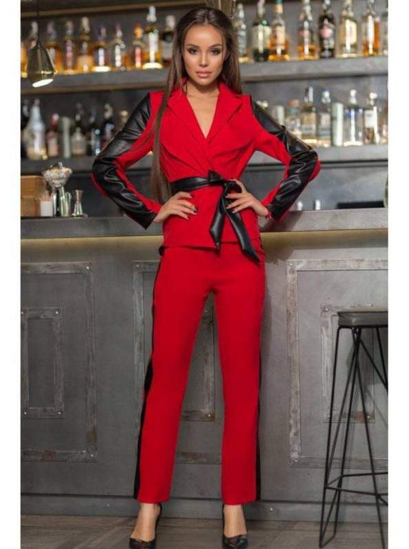 Очень красный брючный костюмчик с лампасами.