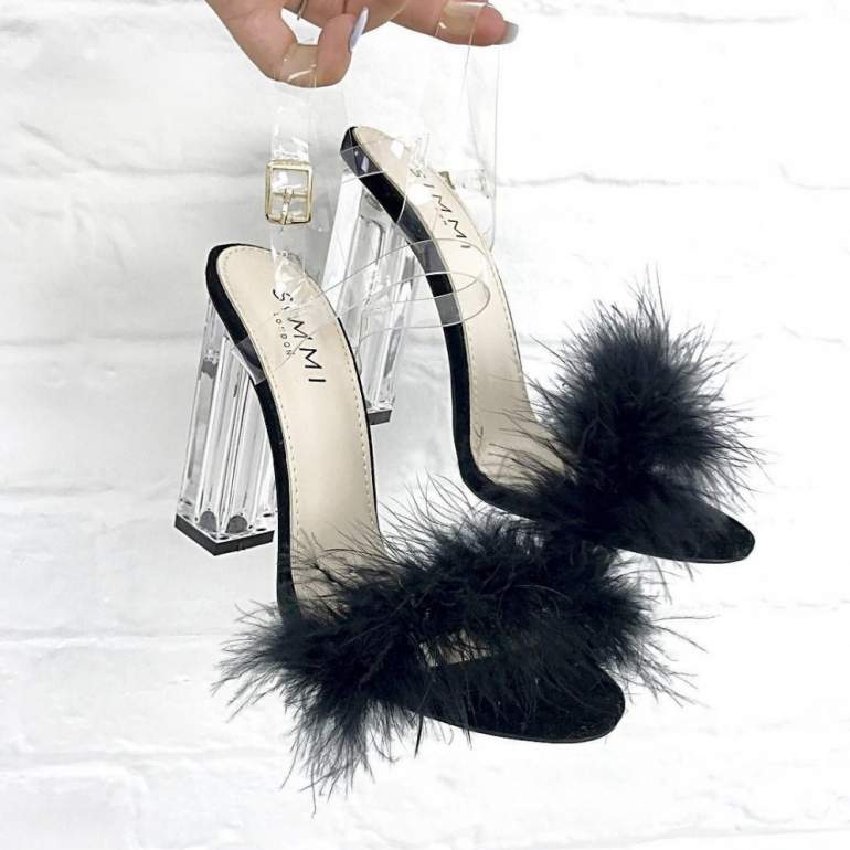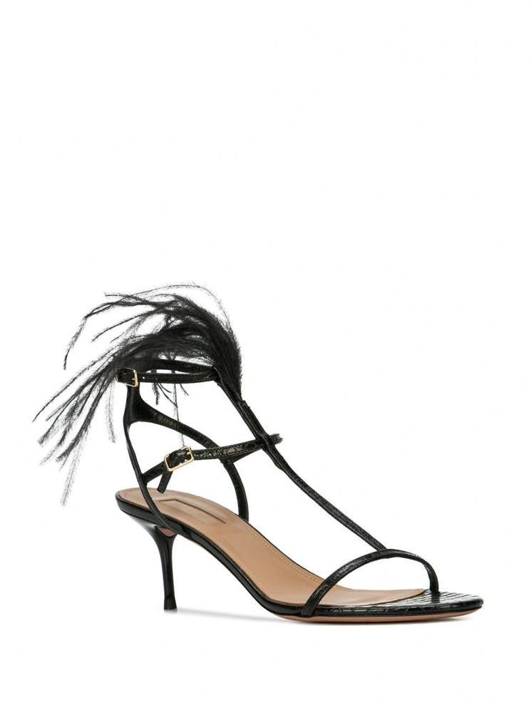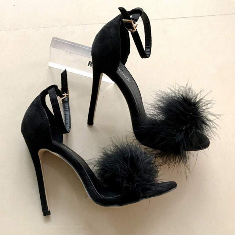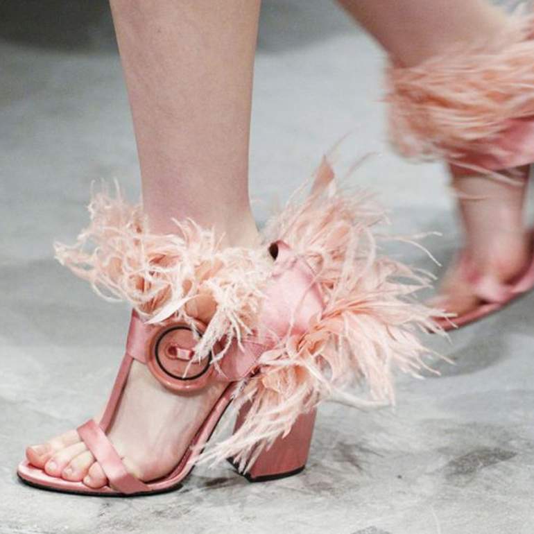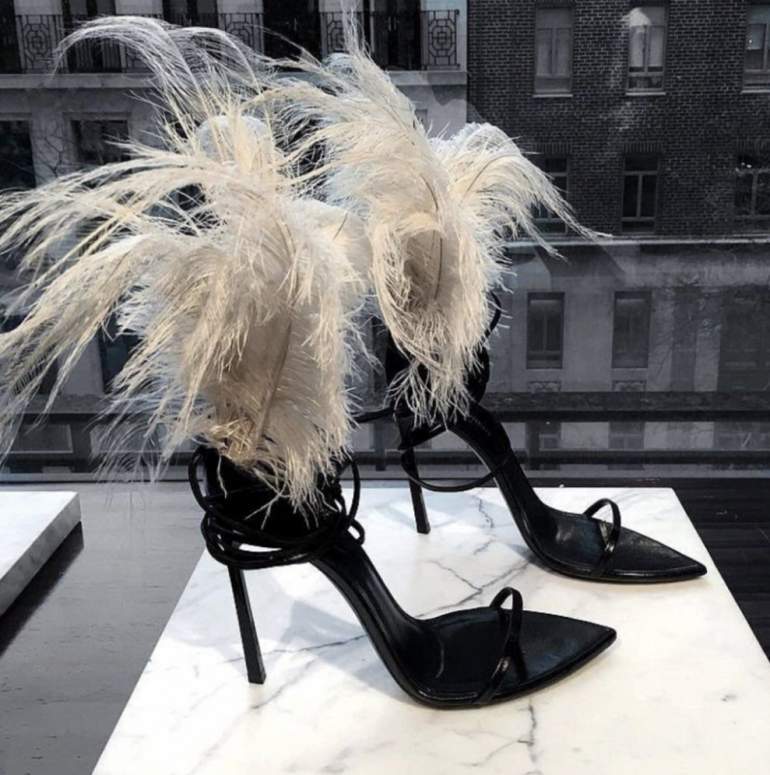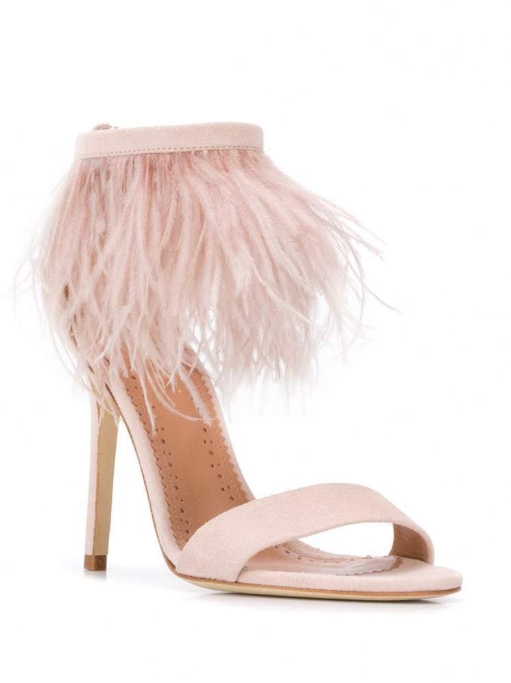 Босоножки на каблуке с перьями.