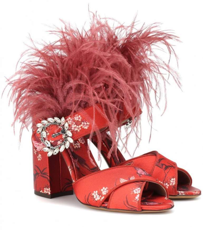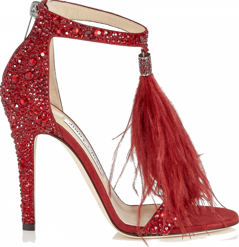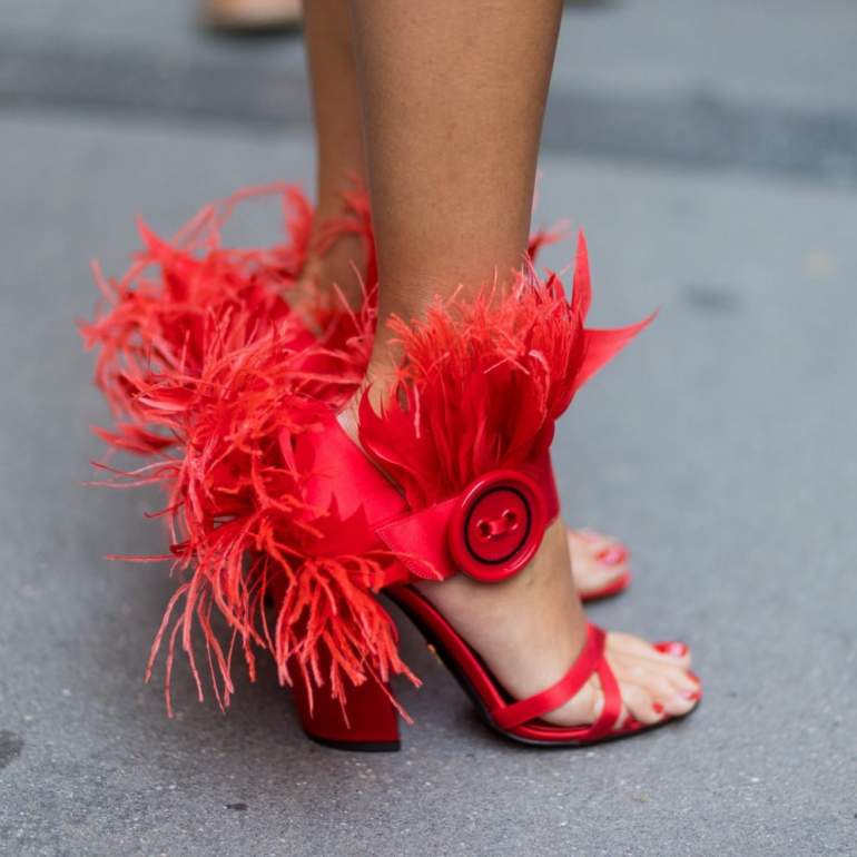 Босоножки с перьями очень красные.