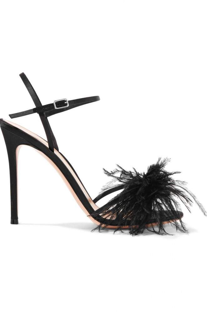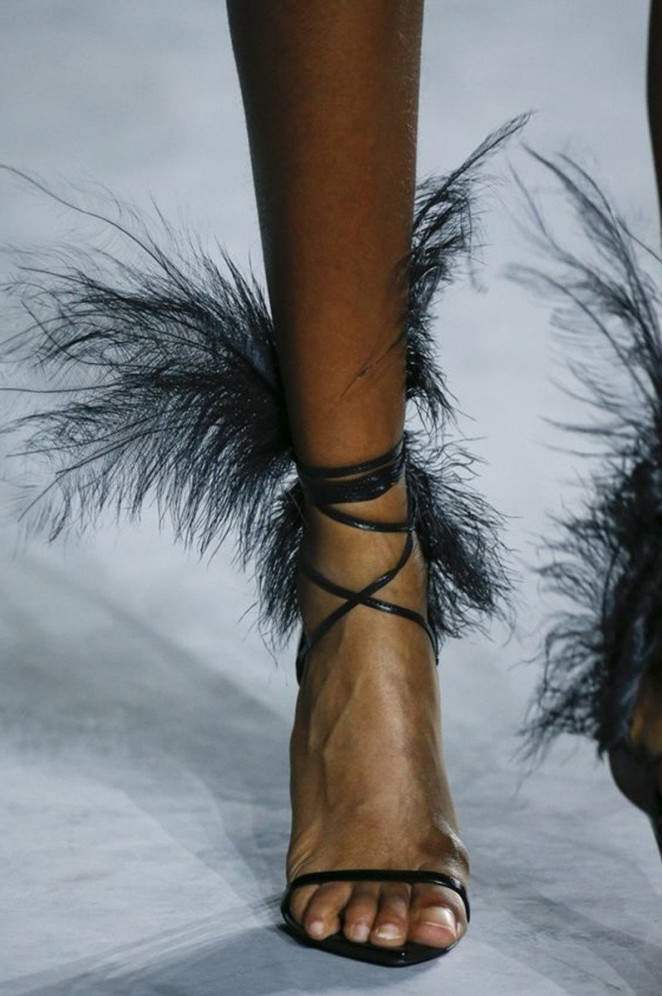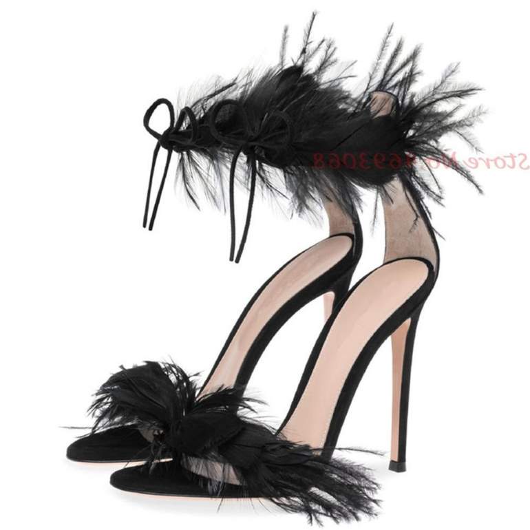Темные босоножки с перьями.
