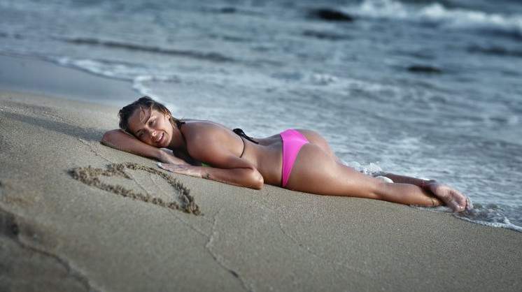 Эротика с брюнеткой в купальнике на пляже.