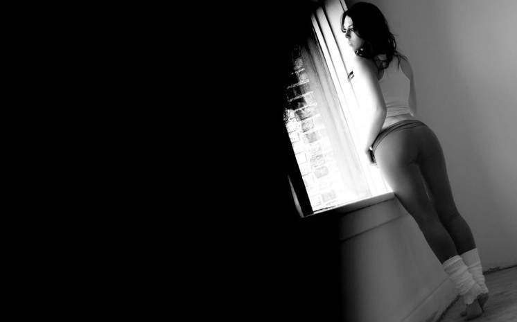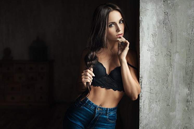 Девушка в Нижнем белье у стены.