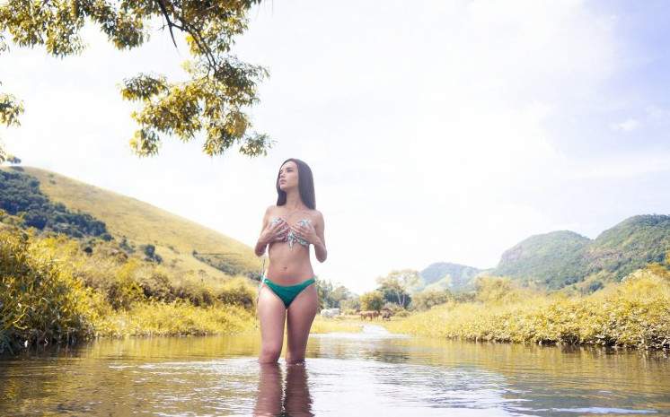 Очень сексуальные женщины в купальниках на реке.