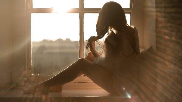 Красивая девушка около окна спиной.