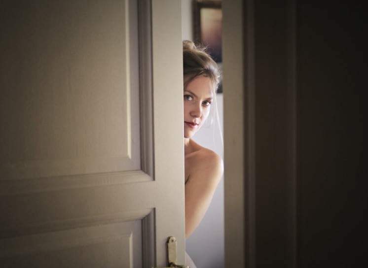 Красивая девушка приоткрывает дверь.