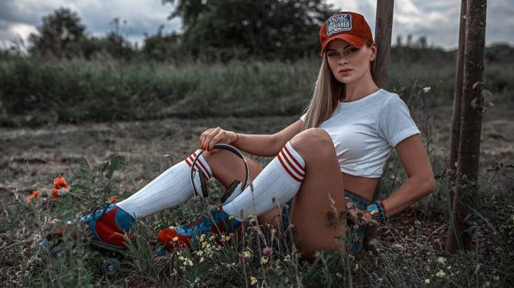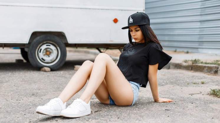 Красивая девушка в кепке и шортах.
