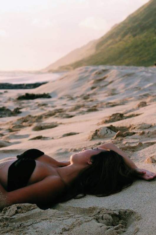 Красивая девушка лежит на песке.
