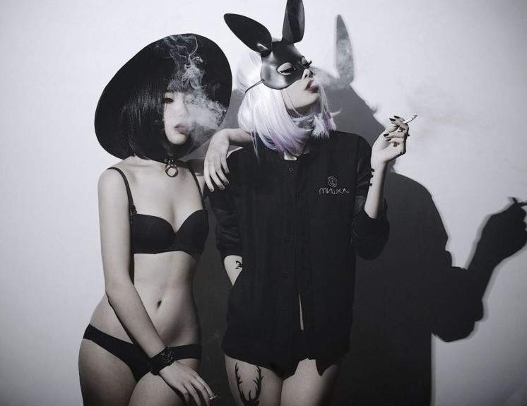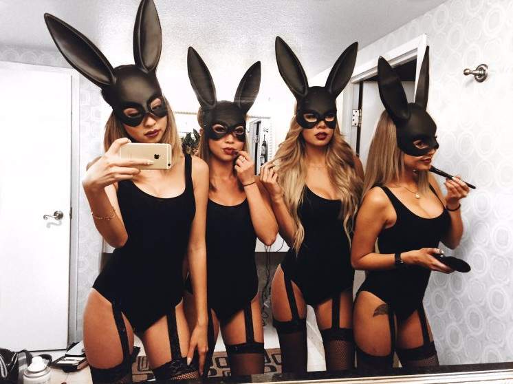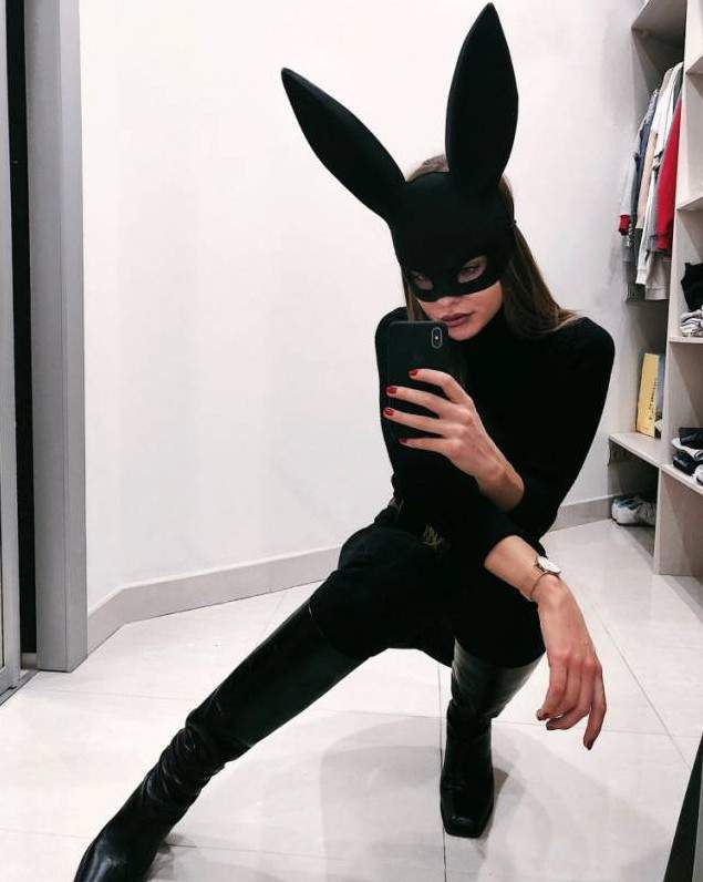 Девушка в черной маске зайца.