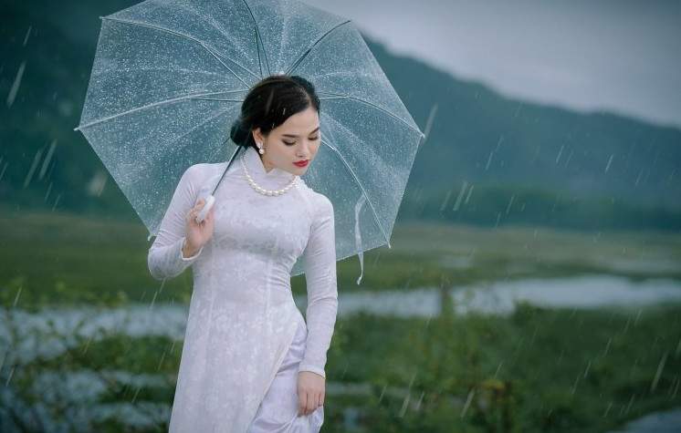 Красивая девушка в белом прекрасное платье под дождём.