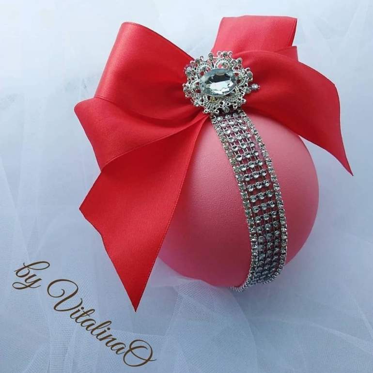 Очень красные новогодние шары с бантом и стразами.