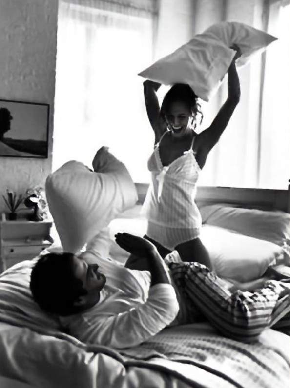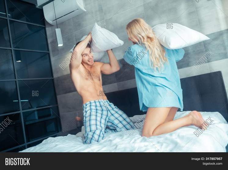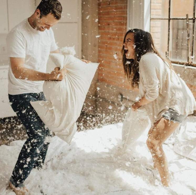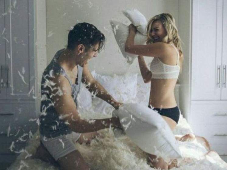 Влюбленные дерутся подушками.
