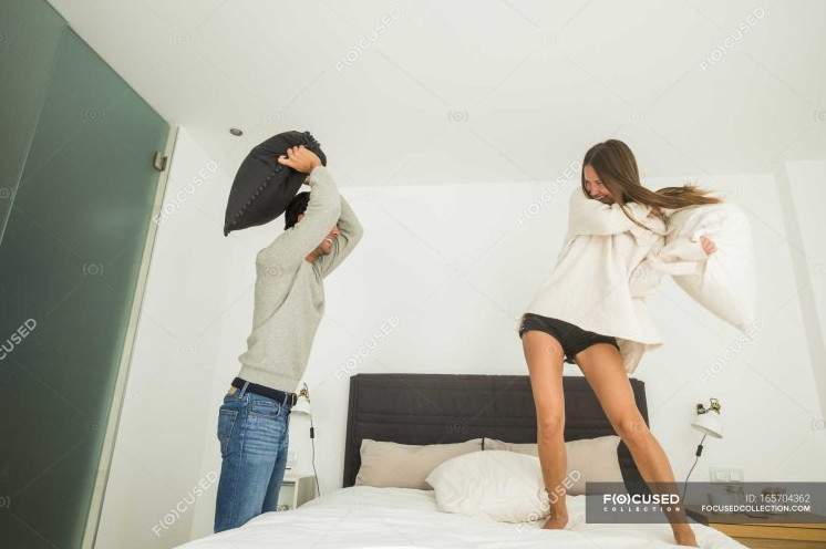Стычка подушками на кровати.