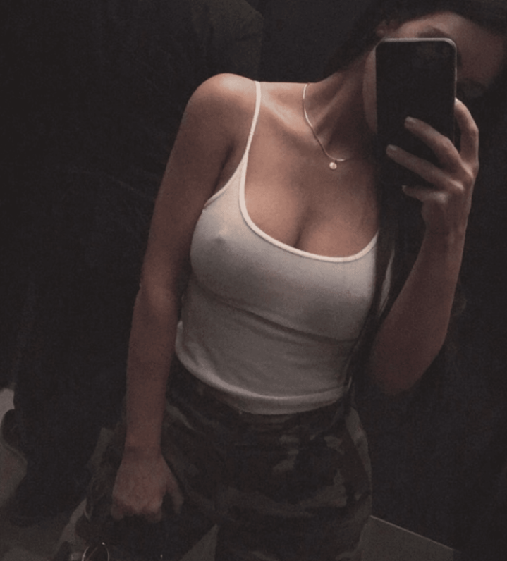 Красивая девушка в майке селфи.