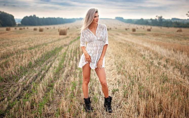 Деревенская прелестная прекрасная женщина в прекрасное платье.