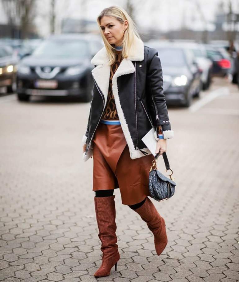 Маленькая дубленка женская с ботфортами.
