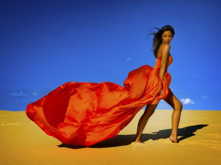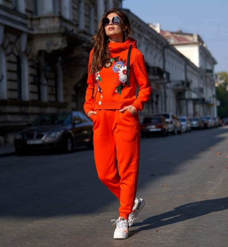 Девушка красавица в оранжевом костюмчике.