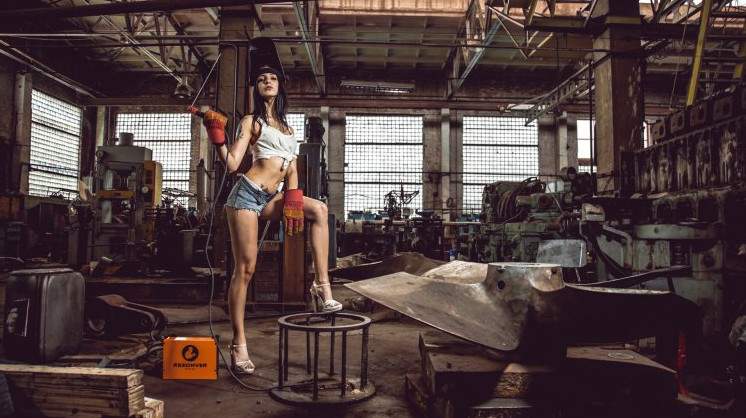 Фотосессия милых красивых женщин на заводе.